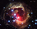 Bức ảnh thứ ba chụp một ngôi sao đang tiến hóa có tên V838 Monocerotis. Những tia sáng của nó rọi lên các đám bụi khí bị một con gió sao đẩy ra từ trước đó. Gió sao (với thành phần chủ yếu là các điện tử và proton năng lượng cao) ngăn cản đà tăng trưởng khối lượng nhân của "tiền sao".