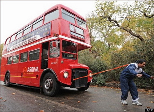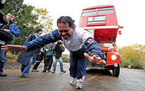 Tháng 11/2009 tại công viên Battersea, London (Anh) Manjit Singh đã hoàn thành phần biểu diễn kéo chiếc xe buýt nặng 8,5 tấn đi trên quãng đường dài 21,2m. Theo giới thiệu, người đàn ông 59 tuổi này còn là chủ nhân của nhiều kỷ lục phi thường khác như dùng tai kéo một chiếc máy bay chở khách nặng 7,4 tấn hoặc dùng tai nhấc bổng một vật nặng 85kg...