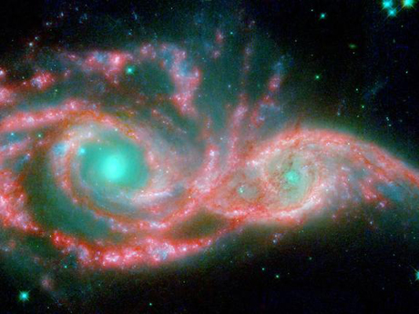 NGC 2207 và IC 2163, tên của hai thiên hà xoắn trong chòm sao Canis Major, đang trong quá trình sáp nhập thành một thiên hà. Các nhà khoa học của Cơ quan Hàng không vũ trụ Mỹ (NASA) đã dựng lên hình ảnh của chúng từ dữ liệu hình ảnh của kính thiên văn không gian Spitzer (màu đỏ) và kính thiên văn không gian Hubble (màu xanh).