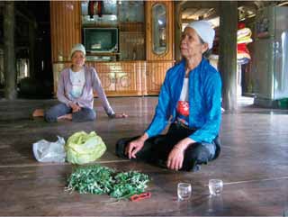 Đang dở câu chuyện thì có hai người phụ nữ đứng tuổi vào nhà xin “bùa phép” của “mế”. Tận mắt chứng kiến bà Viển “xin” thuốc của tổ tiên cho bệnh nhân, chúng tôi không khỏi ngạc nhiên. Trước hết, bà lấy một nhúm lá cho vào hai gói nilon nhỏ, sau đó bà dùng dao con cạo vào hai đồng xu cho mạt vụn rơi xuống gói thuốc rồi gói lại. Tiếp đến, bà khấn mấy câu “thần chú” trước bàn thờ gia đình, đến khoảng 5 phút bà sau trao cho người nhà bệnh nhân và kèm theo lời “hướng dẫn sử dụng”.