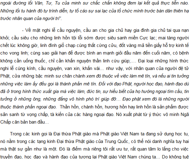 Phật Pháp đến ngày nay càng tệ hại suy vi, vuồn cuộn chẳng biết bao nhiêu là sóng gió. Trước kia Tăng Ni trong toàn quốc còn có tám trăm ngàn người. Năm ngoái chỉ còn có hơn bảy chục ngàn người. Mười người chín kẻ hoàn tục! Đây tức là không có tâm trường viễn, không có tâm kiên cố. Gặp lửa dữ đốt tới thì chân đứng không vững liền. Nếu là đệ tử Phật thứ thiệt thì phải lập chí son sắt, cứng rắn. Trước hết học oai nghi, giữ đúng quy củ, để khỏi sợ người khác phê bình đầu óc mê muội. Rồi dốc lòng tôn kính phụng sự đạo lý và giới luật của Phật; bởi do nhiều kiếp trồng căn lành, nên kiếp này mới đặng vào cửa Phật, vậy thì cần gắng sức cầu đạo trừ bỏ thói hư, chẳng vào chốn danh lợi, chẳng làm tôi mọi cho bậc quyền thế. Trừ bỏ những thói xấu trong tâm mình từng chút từng chút một. Được vậy tức là người đại tu hành, sẽ vào được lý thể. Đó là vì tâm kiên cố trải qua lâu dài chẳng biến; tâm bình thường đối động tĩnh luôn nhất như. "Nho sĩ là tội nhân của Khổng Tử; Tăng sĩ là tội nhân của Phật." Ngài còn nhấn mạnh: "Kẻ hủy diệt Phật Pháp chính là giáo đồ của Phật Giáo, chứ không phải các giáo phái khác. Kẻ làm cho Lục Quốc diệt vong chính là Lục Quốc, chứ không phải nhà Tần. Kẻ làm suy sụp nhà Tần chính là nhà Tần, chứ không phải Lục Quốc vậy"